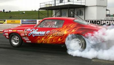 Colin Roaf is a longtime drag racing fan who with daughter Grace is an enthusiastic supporter of Eurodragster.com. In September 2007 Colin took up an offer from UK Pro ET racers Carla Pittau and Rick McCann of a passenger ride in their Small Block-powered Heaven and Hell Camaro at the FIA European Finals Press Day at Santa Pod Raceway. This is Colin's account of a dream fulfilled for a fan on the Bank. Some history I first started going drag racing during the late 1970s. My second job after leaving school was as a Trainee Auto Electrician for Volvo Trucks and Buses. One of the technicians found out that I was a member of a West London Custom Car Club I couldn't even drive, I used to get the bus to the club meetings! He mentioned that a couple of his friends campaigned a Plymouth Roadrunner in the Production class and asked if I would like to go down for the weekend and help out. A Friday evening after work saw me with a tent, a change of clothes, a toiletry bag and a case of beer heading out to Maidenhead to rendezvous with the guys. The tent etc was thrown in the back of the Roadrunner along with tools, a jack and some slicked-up rear wheels and we were off to Santa Pod. It was just like Two Lane Hardtop. There was no rear seat and I was holding on for dear life as we took the back roads to the Pod. At the Pod, the exhausts were taken off and the rear wheels replaced with the slicked-up wheels from the boot, and Richard went on to to compete against Ron Pudney, Sylvia Hauser and Dave Mingay etc. After a walk around the pits, I was hooked. The diversity of the cars and bikes was amazing and is one of the reasons for my continued interest. The Custom Car Club started to make regular trips to the Pod and also to Blackbushe Airport. A regular long weekend for us was to attend Wheels Day at Slyfield in Guildford on Good Friday, followed by spending the rest of the Easter Holiday at the Pod. Some members of the Club became unofficial crewmembers when a local chap brought the 440-powered Ford Pop Liquidator. Pete Goddard competed in Liquidator in the Competition Eliminator class and was involved in the infamous Swedish Hemi Jeep incident during a World Finals event in the early 1980s. See the Snippets section of Chris Dossett's excellent Trakbytes site for a description of the incident. The essence of the above is correct but the facts are thirty years old! I continued attending the Pod through the 1980s and into the early 1990s, encouraging new people to come along as I could. Changes in circumstances meant that I was unable to keep up my attendance until I returned with my then nine-year-old daughter Grace in 2005. And so to the trackFast forward to 2007, and during the quiet midsummer break, Grace and I together with my brother and his son attended the London Drag Racing Show in Ruislip organised by Paul Knight. And what a great job he and his associates did. The show was a very laid-back affair. The racers displaying their cars and bikes were able to bench race with each other and to chat to interested fans like ourselves. The absence of barriers meant that it was possible to get good close-up photos without feeling that you were getting in the way, as it can feel during race meetings. I was already very aware of the Heaven and Hell car after seeing it leaping skywards at the majority of the race meetings which Grace and I had attended. The visual impact of the paintwork also marked the car out. A mention on Eurodragster.com about Tog being allowed a drive prompted me to ask Carla when that might happen again. An invitation to sit and chat was gladly taken up and Carla offered me a passenger ride. An introduction to Grace and the signing of her autograph book by Carla and Rick was greatly appreciated and with promo pictures in hand we set off with an offer which I never thought would be made. A little personal background here. I am Mister Conservative. I don't usually get out of my comfort zone very often. Although my mates in the Custom Car club all had quick Yanks and Rods and I got to experience some very fast road trips, and I also got thrown around a rally stage by a rally driving mate, I've never had a quick road car of my own. As I've got older, I have got less adventurous and here I was contemplating the ultimate thrill ride. Would I go through with it? Especially as I spoke to other racers that we have got to know who expressed the opinion that they probably wouldn't, although they were quite happy to strap themselves into all sorts of outrageously quick machines and drive themselves. As the designated day approached I was still undecided, but finally told myself to stop being a wimp and just do it , as I might never get the opportunity again. I made the necessary arrangements to get the day off in the middle of the week and duly started out to get to the Pod. I had to stop a number of times to check Grace hadn't stowed away! As I got nearer the track, I started to catch up with various European drag racing team trucks and transporters as they completed their journies. Organising the FIA European Finals must be a logistical nightmare, but when I arrived the pits were relatively empty and I located Mike Lacey of Metamorphosis fame. He had been in contact with Rick and Carla who had got held up in some traffic. I took up his offer to dump my rucksack and strolled over to watch as some of the other cars running passenger rides or demo runs came through the timing lights. Rick and Carla arrived and I followed them back to their pit area next to Mike's where Heaven and Hell was unloaded from the trailer and pre-flight checks commenced. Rick and Carla had kindly supplied the necessary safety equipment and after I had performed a very dodgy striptease I was suited and booted in Nomex. Looking in the wing mirror of the tow truck, I realised I looked the part and also that due to Rick and Carla's influence I was quite calm. The well oiled machine that is Heaven and Hell Racing finished the