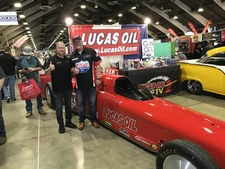 If you would be interested in supporting us then please take a look at the sponsorship proposal (click on image at left). The class is guaranteed coverage; you only have to look at all the wheelie shots on Eurodragster.com's live galleries. Your logo could be there. You can contact us via Facebook or at heavenhellracing@icloud.com. 7707 on show. 9th February: Geoff Stilwell's updated 7707 Lucas Oil Land Speed racer made its 2020 début at the Grand National Roadster Show, one of the largest car shows in the USA if not the world, at the world-famous Pomona County Fairgrounds in Los Angeles in mid-January. Geoff writes: The build of 7707 was headed up by award-winning Mick Jenkins at the famous Mick's Paint and Landspeed Workshops in Los Angeles, with most of the design work created by fellow Landspeed Racer Kiwi Steve Davies. Since August 2019 the car has received a few updates and one very important piece of equipment – a new carbon fibre Spitzer rear wing intended to help the 5000 bhp supercharged and injected nitro-burning V8 race car stay straight when Geoff is charging down the Bonneville Salt Flats this August, when the aim is to set a new class record at over 300 mph. The team exclusively uses Lucas Oil Products. When you are building a car which can exceed 300 mph, you need to be able to rely on everything working properly. So we use as many of the top Lucas Oil products as we can. From cleaner to engine oil, assembly lube and transmission oil to spray polish and the penetrating oil, especially as this protects all the Heim joints from the ravages of the salt.
