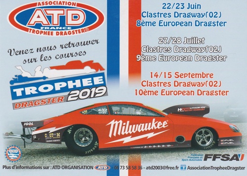 For a team which has previously only raced in a National series, the coming season is going to be demanding. "Sure, it's going to be a challenge", says Jere. "But I believe we are up to it. Though I consider myself a mentally strong and seasoned race driver, I still feel a bit anxious. The competition in Pro Modified is extremely tough. Unlike other teams we're not familiar with most of the race tracks. However I have faith in my team and our equipment. Like most drivers on the verge of a new season I'm just itching to get behind that steering wheel." 2019 French ATD calendar. 6th April: Many thanks to Élodie Dubois for sending us the 2019 Association Trophée Dragster calendar for 2019, which takes in three dates at Clastres in France and to which all are welcome: