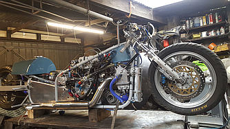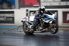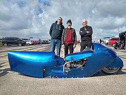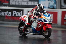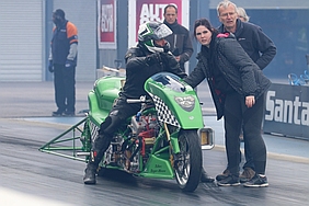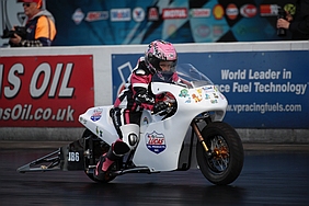 Former Pro Mod racer Roger Moore (pictured right) brought his renamed and repainted Box of Frogs Racing bike back with team Lucy Moore, Dave Moore, Gary and Bob Brooks. The team reported that the burst panel went on the end of the first run and pneumatic issues pestered for the rest of the day with the pressure regulator being the source of failure. The team worked tirelessly trying to repair the regulator but sadly to no avail.