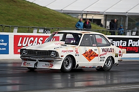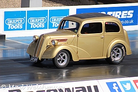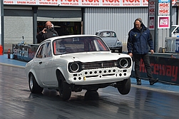 Ben Kennedy's Outlaw Anglia made a pass with new Centerline wheels. We also saw FWD racer Ahmed Jamshaid, who ran a 10.2926/136.42 in his roadgoing Civic with K24 engine (he also has a race-built K20 engined Civic tuned by Liam Garratt of Street racers rolling road tuning & remapping). Mark Moseley (see picture, left) brought out an injected Pinto-engined Escort Mk1. Matthew Wright had a turbocharged V8 Escort Mk2 with a single 105mm turbo, another addition to his fleet of race cars, the twin turbo Rolls in the process of having a 14-71 supercharger blown into by the turbos, so it can run in Supercharged Outlaws.