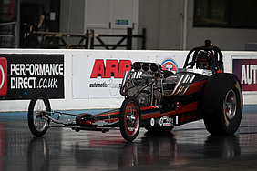 David McCallan broke into the 8’s after his winter completely reworking the pickup and weight loss programme on the chassis and components. Lots more to come from that team. It was great to see Doug Bond in the record setting Nuthin' Fancy slingshot. Roy Wilding had some fairly wild rides in Chariots of Fire but held on and showed real promise for the coming events. Paul Dale showed real promise with the Acute Angle but decided to back off on the Sunday with slicks that were just not gripping...although there were some real “trouser” moments along the way. Gary Parkes strolled straight into the 7’s from previous seasons 8’s with a storming 7.80 and this was promptly backed up by even more 7 second passes until some minor engine trouble for early resignation from the event.
