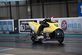 Whilst weather on Sunday precluded any running, there was testing on Saturday by the cars and bikes present. Harald and Clarissa Czekalla, usually photographers brought out their ex-Brian Gandy altered with new Chevy power and assisted by Gerd Habermann. Christian Jäger was testing his Super Twin Top Fuel bike, which he managed to keep in the groove by some adept handling. Also seen were the new Camaro doorslammer of Walle Strobel and the Volkswankel Jetta which is headed for Super Comp action.