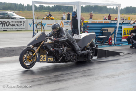 There was some nitro bike action including Top Fuel Bike rider Mikko Rajaniemi on the former Sverre Dahl/Norbert Kutzera/Kai Selkamaa Puma Yamaha and Samu Kemppainen his V60 engined Super Twin. The performance star was Vesa Lipponen, riding with Jaska Salakari doing the tuning. Vesa ran a best of 5.921/217.75mph on the Saturday. Video of this run is at this link.