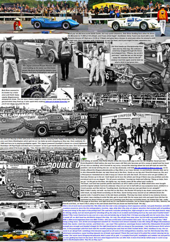 I must say that it's all a little different from the late '60's, when I used to write the timing slips out at the ol' Pod. In those days, we used to get quite a number of USAF guys running these cars when they were brand new, albeit a little slower than today. Heaven.