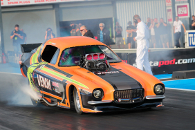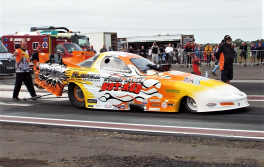 Nostalgia Funny Car racer Andy Raw suffered clutch dust issues as this video link shows, thanking Tony Betts for the loan of an oxygen bottle. Andy also brushed the wall but the only damage was to the headers.