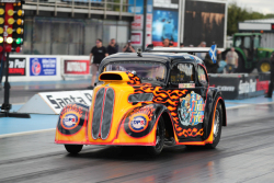 Up to that point the event was a success, with four qualifying sessions for all classes completed on Saturday and some close racing on Sunday. Among the outstanding moments, in Street Eliminator we saw Mark Todd in his Aston Martin run a best of 7.014/209.84 after several runs in the 7.0s and Jason Weir taking his Plymouth Suburban to a best of 7.9622/175.75. The excitement extended to Track Worx Comp Eliminator where Kev Slyfield in his Pro Mod T-Bird ran a fantastic 5.9767/239.48. In Leeks Landscape Funny Bike, Stu Crane got his new turbo setup to a 6.912/198.03. The Exhibition class contained three nitro bikes, a nostalgia Funny Car and the new ex-Rickie Smith Pro Mod Camaro of Bobby Wallace.
