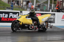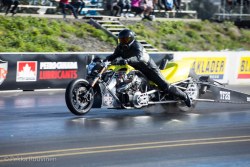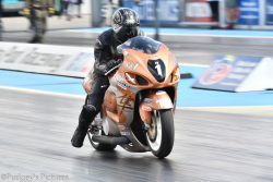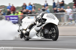 The Storm Drag Bike team, with rider Lorcan Parnell, said 'Our quickest run on Saturday (6.9291/195.54) didn't count and Mick had to make an emergency clutch repair last night. We hoped the wind would die down on the Sunday which it did however after just making it to the qualifying session this morning the inlet cam (one of Brian Johnson's old ones) broke in the burnout'.
