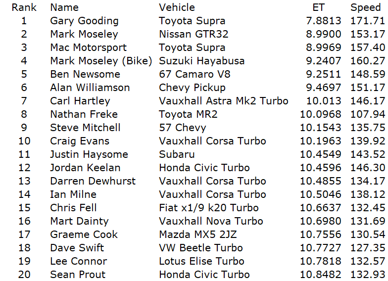 Supercharged Outlaws: Class awards: Gary Parkes, Andy Park, Andy Hadfield. Best time: Joel Kerr 7.0012, runner up Robbie Grabham 7.5301