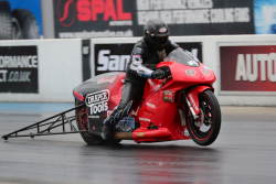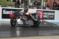 Stu Crane from Warpspeed Racing (Funny Bike) showed a picture of a damaged slick and as the team had no spare, he had to withdraw from eliminations having run 6.912/198.03 in the final qualifying session on Sunday.