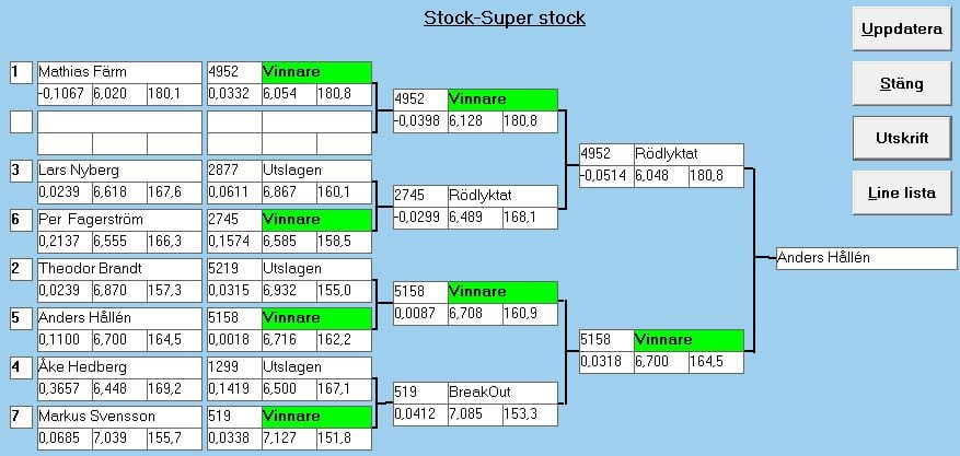 In Super Street Bike, three riders, Toni Suokas, Vesa Ruhanen, and Ida Zetterström, competed and Ida improved on her six second performance in the previous race, running an amazing 6.885/338.300 in qualifying (new Finnish record and second quickest SSB in Europe) and a 6.905/346.95 to defeat Vesa Ruhanen's 7.311/322.44 in the final.