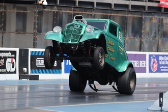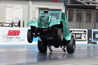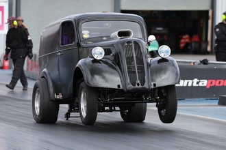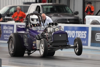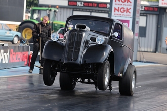 Gasser Circus had a great field of 14 cars qualifying for Sunday eliminations. Ray Irish was #1 and the top ten were less than 0.1 over their dial. In eliminations, new boy Nick Hewison in his Fordson was the victor after defeating Adam Kruczynski, Billy Jones, Jason Pickett and a no-show Martyn Hallam (pictured practising for the wheelie competition which was sadly rained off).