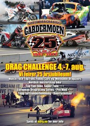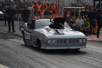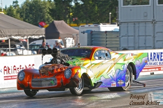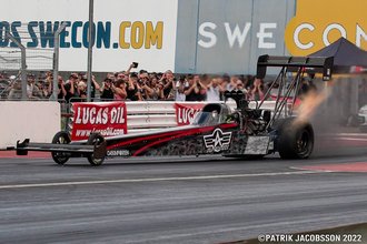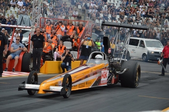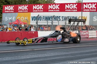Top Methanol was won by Jonny Lagg whose team had a consistent setup able to run 5.5s and dip into the 5.4s. The competition was tough though with the repaired funny car of Sandro Bellio qualifying #1 with 5.577/401.81, a great credit to the team after they had rebuilt the car which had a bad top end fire at Tierp 10 days earlier. The increasingly consistent funny car of Linn Fløysvik and dragsters of returnee Silvio Strauch and Tony Bryntesson made up the field. Silvio's team had breakage in qualifying then after he had defeated Linn in round one, a glitch on the tree caused his semi final race to be re-run with Sandro Bellio coming out the victor. In the meantime Tony had shown improved performance running 5.767/405.64 but red lit against a quicker Jonny. The final was a close race between Jonny 5.468/425.33 and Sandro 5.693/412.41.