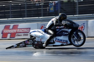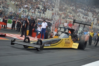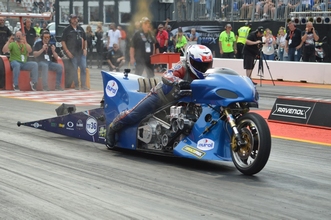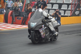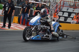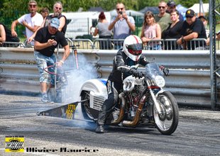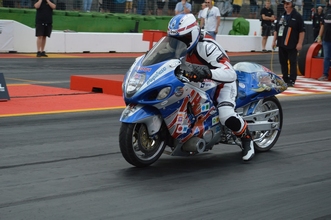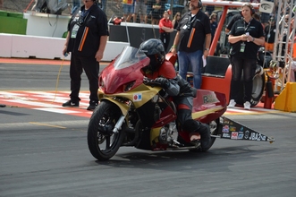In eliminations however Bertrand suffered another stall in round 1. He admitted "It's a disaster for the team, out of our 6 attempts, only one run was successful during qualifying. We made a lot of mechanical changes, one by one, we went back to simple settings that worked repeatedly in previous years… yet only luck gave us a chance in Q3. Keeping the same in Q4 then in E1, we stalled like all the other times. We will remember that there is no costly breakage, that the engine has monstrous potential that we are unable to exploit, and that the steering is good when everything is working. Thanks to the Greek team from Bousinis for the loan of a mechanical part. Thanks to Roger Lyren - Lyrén Motorsport Pro Stock Motorcycle Team for all his precise advice once again, and the help provided during the weekend."