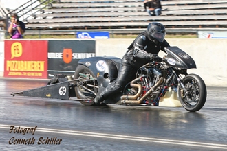 Also in the low 7s was Chris van Nimmen (above left), who posted "Hockenheim was a successful race weekend. Qualified 5th and again learned a lot about the motorcycle and driving experience gained. In the eliminations we had a hard time with mechanical bad luck! A rocker arm broke off and a pushrod came out of the intake valve. As a result, nitro flowed out of the intake. We are at home now to rebuild everything and leave for Denmark on Wednesday Mosten Rock N ́ Race . Thanks to my team, supporters and sponsors for this weekend.