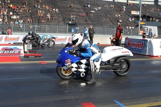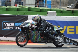 Eventual #1 qualifier Bertrand Maurice (below left) with Light Speed Drag Racing had a problem stalling, one which reflects the harsh transmission load on launching. He posted after second qualifier, rerun on Saturday after rain interrupted Friday that he was going to try something different for his third qualifier after two stalled starts. He said "After two days of struggle for Team Light Speed in Q3, Bertrand finally pulled himself off the starting line and hit a 7.234 seconds at 290km/h that put him in pole position. We then tried a few tweaks to improve and get the feel back in Q4, but the bike stalled again.
