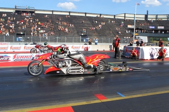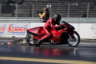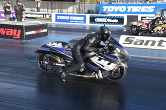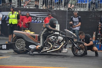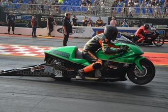Top Fuel Bike was won by Rikard Gustafsson who had a clear performance advantage over the rest of the small field of bikes with consistency. In qualifying Rikard ran 6.14, 6.11 and 6.04 and the other nitro bike, Rene van den Berg (above right) was running consistently in the high sixes. The two Funny Bikes eligible for TFB were Eric Richard on a best of 6.885 and Thomas Pettersson running a best of 7.034 in the final session after missing the first two sessions. In eliminations it was nitro bikes v funny bikes in round 1, with Eric shutting down before the burnout and the nitro bikes continuing to run to form. The final was a great pairing with Rikard running a 6.089/396.75 (top speed, 246.52mph) to Rene's game 6.586/320.91.
