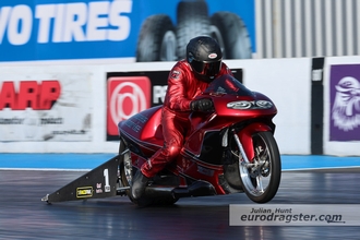 Jörg Lymant (Pro Stock Bike): ET 7.283, speed 292.25kph (181.59mph)