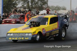 4.982/278.14 pass in one of Rune Fjeld's Top Fuellers at Santa Pod Raceway yesterday (Saturday). This is only the second four-second
