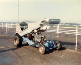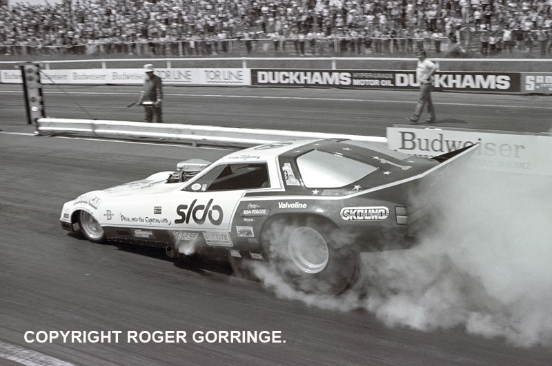 The Funny Cars comprised US visitor Harlan Thompson and Norwegian Rune Fjeld. These two made practice runs on Saturday prior to the competition on Sunday. Harlan's Dodge Omni sponsored by Dodge and titled 'Protector' ran 6.99/168 but damaged the block on the run. Rune had recently imported Al Bergler's Motown Shaker '82 Trans Am and in his third meeting with it ran a 7.49/161 in practice. Bootsie Herridge broke in a new pair of slicks with a spectacular 250 yard burnout and Bill Sherratt experienced an out of shape launch on Saturday.