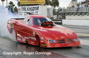 Popular fan favourite John Force passed an up in smoke Bob Bode to open round one, a winning 4.087/310 beat the troubled 8.061/98. Cruz Pedregon suffered the same tyre blistered tyre pass as Bode as he faced his brother Tony Pedregon, a 4.128/310 beat the 8.771/90. Ron Capps caught and passed the leave by Del Worsham running a winning 4.072/310 at over a car length to the losing 4.157/306. Matt Hagan upped the fastest ever speed in the class with a 4.061 at 316.15 mph in beating the 4.223/268 from John Smith. In a close leave Robert Hight managed to stay ahead and win by several car lengths, a 4.122/305 to the losing 4.223/301 from Jim Head. The next pairing was all female and what a pedalfest it turned into as Ashley Force Hood hit tyre smoke then pedalled out of a crossed up situation only for Melanie Troxel to get loose and pedal. Troxel took the win 5.324/158 to the 5.980/34 both getting rapturous applause from the appreciative crowd. Jack Beckman hit tyre smoke at two-hundred feet out that put paid to his event, a losing 6.672/94 had Bob Tasca III take the 4.139/308 win. The last pair in the frame were Tim Wilkerson and Jeff Arend and Arend suffered the tyre smoke as did Beckman slowing him to a 5.520/190 as Wilkerson took the 4.188/283 win. The second round opened with a close race as Tony Pedregon stayed ahead with his holeshot against Melanie Troxel, a 4.113/310 beat the 4.164/307 try. Ron Capps overcame the holeshot by John Force and the ticket read 4.066/312 for the win to the 4.135/310. A mere two-thousandths separated the leaves by Tim Wilkerson and Matt Hagan and Wilkerson clinched the deal with a 4.094/307 as Hagan slowed to a 4.465/284. The last pair saw the last of the Force team cars go out as Robert Hight struck the tyres at three-hundred feet out slowing him to a 4.804/178 as Bob Tasca III ran the winning numbers, 4.125/308. It was Tony Pedregon's turn to smoke the slicks in the semis as his Nitro Fish machine went almost immediately into smoke giving the race to Tim Wilkerson, a 4.149/298 to an 8.493/85 told the tale. Ron Capps driving the NAPA Filters Charger hazed the slicks and got a little wayward as Bob Tasca III took the light on a 4.125/308 to the 4.562/216 try. Not the usual favourites to go into the final but both well deserved as Tim Wilkerson in the Levi, Ray & Shoupe Inc Mustang left first, Bob Tasca III took off and drifted close to the wall in the Motorcraft/Quick Lane Mustang but it was Wilkerson all the way on a 4.097/303 win to the 4.192/287 lose.