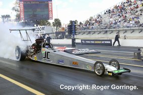 Eliminations were run throughout the early weekend to find the Phoenix winner who turned out to be Mike Edwards. Going out in round one were Vinnie Deceglie to Ronnie Humphrey, a red lighting Greg Stanfield to Jason Line, Steve Spiess to Greg Anderson, a tyre shaking Rodger Brogdon to V. Gaines, Shane Gray to Allen Johnson. Mike Edwards recorded another stunning speed 6.520 at 212.23mph beating Rickie Jones, Johnny Gray lost to Ron Krisher and finally Bob Yonke who runner-upped for the Phoenix event lost to Jeg Coughlin. Round two opened with identical leaves for Greg Anderson and Jeg Coughlin but Coughlin slowed with problems leaving Anderson the 6.587/210 win to the troubled 9.637/93 lose. Allen Johnson got the leave on V Gaines and stayed ahead to gain the light, a 6.600/210 to a 6.616/209 lose. A neat leave by Jason Line kept the lead over Ron Krisher a 6.582/210 win to a close 6.592/210 lose. Mike Edwards continued to dominate catching and passing the leave by Ronnie Humphrey, a 6.549/210 beating the 6.577/210 to end the round. In the semis Greg Anderson was off the power by the tree in his Summit Racing Equipment '09 GXP slowing to a 17.349/43 as team-mate Jason Line surged ahead to take a 6.606/210 win. Mike Edwards notched up another round win when his 6.564/211 got the win light over a losing Allen Johnson in the Mopar/J&J Racing '10 Avenger whose 6.596/210 was not enough. It was the first loss of the season for the Penhall/K&N/Interstate '09 GXP of Mike Edwards as Jason Line in the Summit Racing Equipment '09 GXP drilled him on the lights leaving him floundering, a 6.580/210 beat the 6.556/221 try.