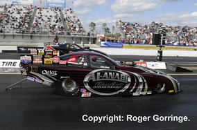 Round one delivered some major surprises as the left lane was not on-song with the first victim, Morgan Lucas going into tyre smoke leaving a tyre shaking Steve Torrence a 3.879/311 win to the 7.782/91 lose. Doug Kalitta fell foul to the same against Doug Foley, Kalitta's holeshot worth nothing as the tyre smoke belched out, slowing him to a 6.519/113 lose and seeing Foley get a 3.959/254 win. Shawn Langdon switched lanes with Chris Karamesines and it paid off as 'The Greek' smoked the hides allowing Langdon through with a small fire and a 3.919/299 win. The lane tables turned then as Dave Grubnic suffered tyre smoke in the right lane as Brandon Bernstein ran the winning 3.891/313 to the 7.263/87 lose. Antron Brown took a 3.973/229 win as Todd Paton slowed to a 7.079/94 lose. A real close race occurred next as Tony Schumacher kept ahead on his holeshot winning with a fine 3.818/320 as Terry McMillen chased hard with a 3.865/304 lose. Larry Dixon overcame the slight lead by Pat Dakin and clinched the win with a 3.824/319 to the 3.952/275. Last pair in the round was Cory McClenathan who raced by the lead from Bobby Laguna to record a 3.816 win at a fastest ever one-thousand foot 322.50mph as Laguna's 3.955/305 came second. Round two opened with Antron Brown powering ahead from half track the try from Steve Torrence, a 3.812/318 beating the 3.862/314. Brandon Bernstein hazed the slicks, got a little crossed up and pedalled but it was in vain as Larry Dixon's 3.831/317 lit up the score boards with the lose being 8.355/82. Doug Foley's day ended with a blower pop at three quarter track slowing him to a 4.332/179 as Tony Schumacher stayed ahead with a 3.839/319. Shawn Langdon showed his mettle as he left on Cory McClenathan and stayed ahead in a close match, a 3.852/317 got the nod to the 3.840/315. The fastest ever one-thousand foot speed fell again in the semis as a match up between Tony Schumacher and Larry Dixon in the Al-Anabi car kicked off, 'The Sarge' left first and held on to record a great 3.822 at a whopping 324.98 mph win as Dixon followed with a losing 3.825/319. Antron Brown kept up his good weekend with a 3.801/318 win over the Lucas Oil/Speedco dragster of Shawn Langdon whose 3.909/304 was not quite enough. The final pitted reigning Champion Tony Schumacher in the US Army machine against team-mate Antron Brown in the Matco Tools car. Schumacher left first and despite a flash fire in the lights took the event win with a great 3.797/322 as Brown pedalled to a losing 6.632/101.