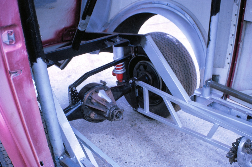 I was very pleased with the front end set up, keeping the standard Ford Popular front end with mini hydraulic telescopic shock absorbers. When we were originally building 'Wild Thing' in 1965, my road car was a mighty Standard 10 saloon and out of interest I decided to see if the Standard hubs would fit on the Ford spindles. To my surprise and amazement they fitted perfectly, which gave a bolt pattern that matched Lotus wheels. Remembering this I fitted a pair of Standard hubs and headed down to JA Pearce Engineering in Southall. This was a race shop that bought and sold circuit race car parts, and I got a pair of magnesium Lotus wheels from them. I can't remember how much I paid but it wouldn't have been a lot. Because magnesium deteriorates, modern wheels have to be dated, and they only have a finite life. I don't suppose those Lotus wheels would be allowed these days but they did the job fine back in the 70's.