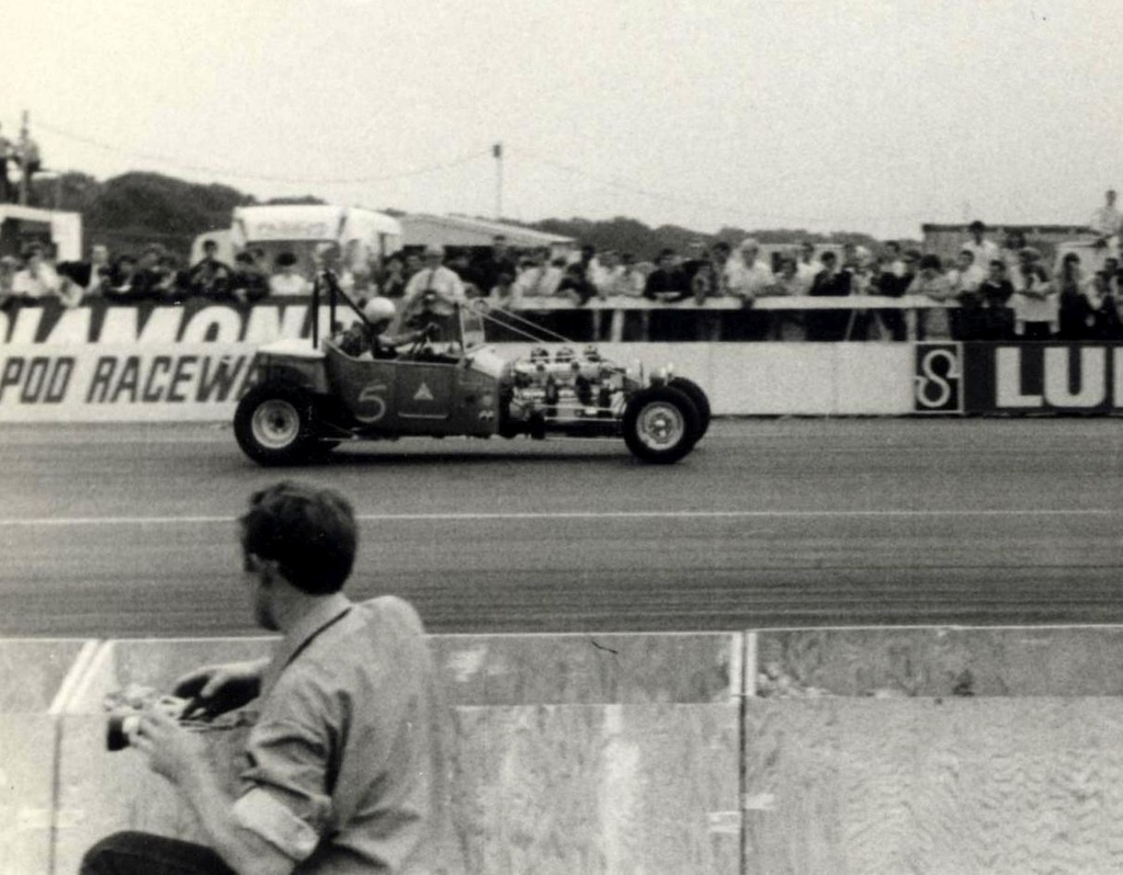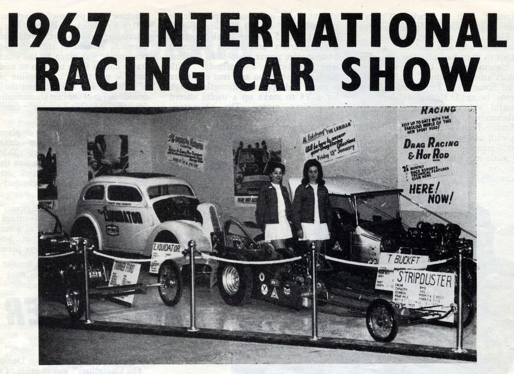 (Geoff’s cat comes in) Hello Hickory Tom, he’ll want his dinner soon I expect. He normally has it at 3 o’clock, I don’t know how he knows the time, he must have a wrist watch or something... Early in 1967 I was invited to display my T at the International Racing Car Show in Olympia along with a selection of dragsters and drag bikes. I took my mum and dad along to see this as they had always encouraged me with my business. I’ll always remember the pride on my dad’s face as he said ‘You’ve made it son’