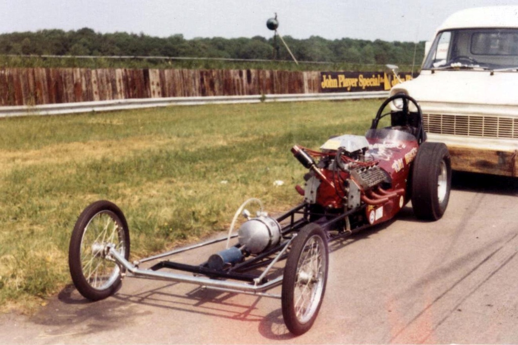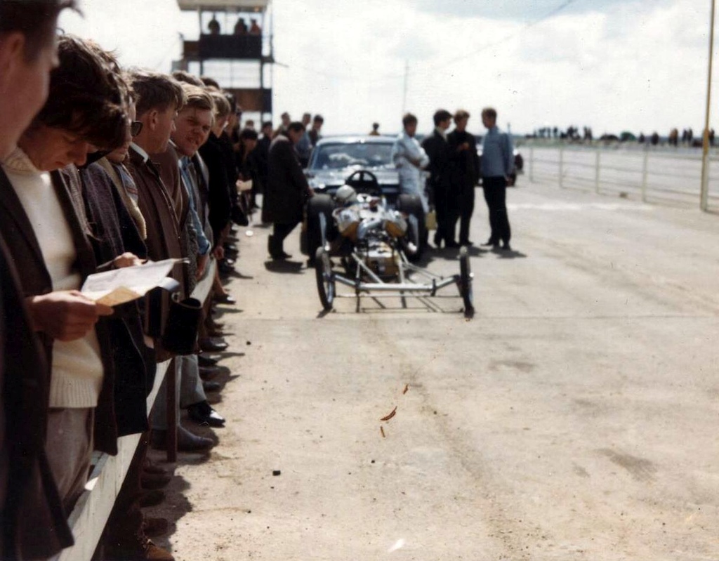 Brian stopped driving early in 1971 and did more of the wrenching and push car driving. He was getting married in 1972 and his intended wasn't too keen on him continuing to drive. At the end of the season, he left the team altogether to crew on Ken Coopers flathead dragster but became involved again in 1979 working with the others on the ‘Vintage Tin’ slingshot. He drove Motor Psycho a few times at the start of 1971 and on one of his last drives at Blackbushe Brian recalled where their dad had done the catering back in 1964.