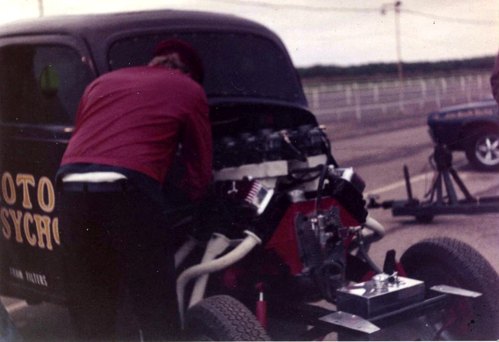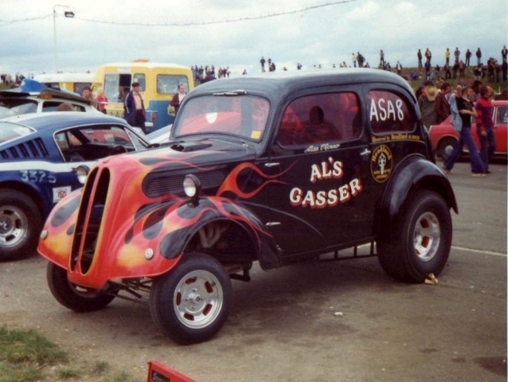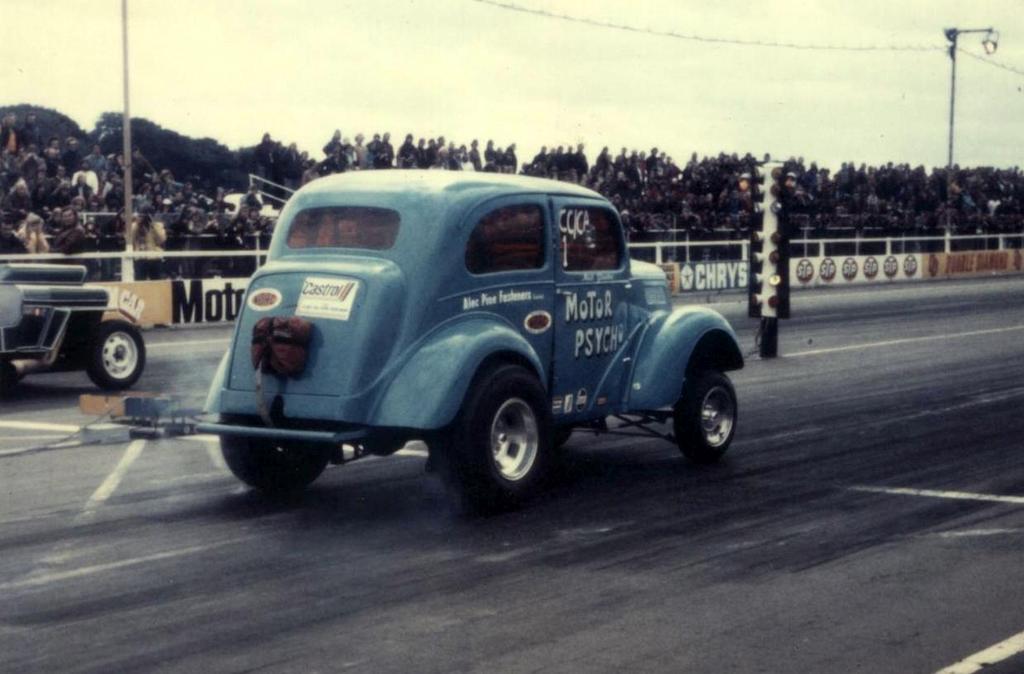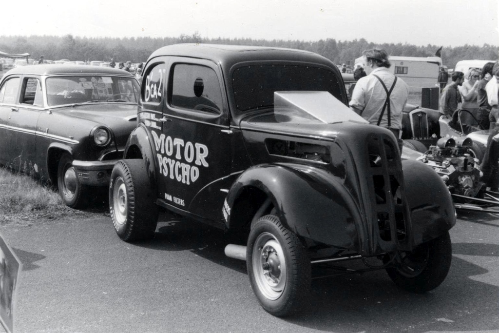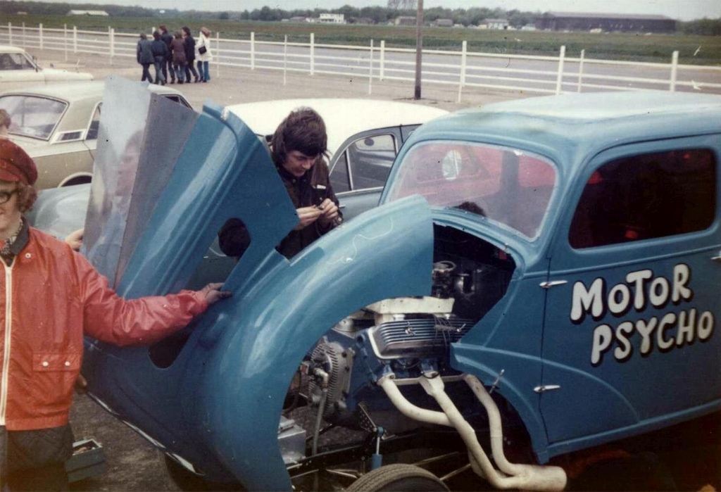 As told exclusively to Brian Mick and Bob Gleadow first got into drag racing seeing an early meet at RAF Chelveston, becoming mobile caterers for some early British events in the sport. Their first car was a Ford Pop which started with a flathead Ford engine, later upgraded to an Olds V8 and named Mangler. Learning more about mechanics and obtaining often hard to get parts, the brothers upgraded the car comprehensively including a strong roll cage and fibreglass body parts with new engine pieces. In 1970 the car was renamed Motor Psycho and was run until the end of 1973, with a new engine in that year, before selling it to Al O'Connor as the original Al's Gasser.