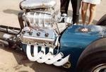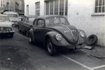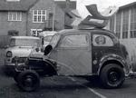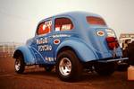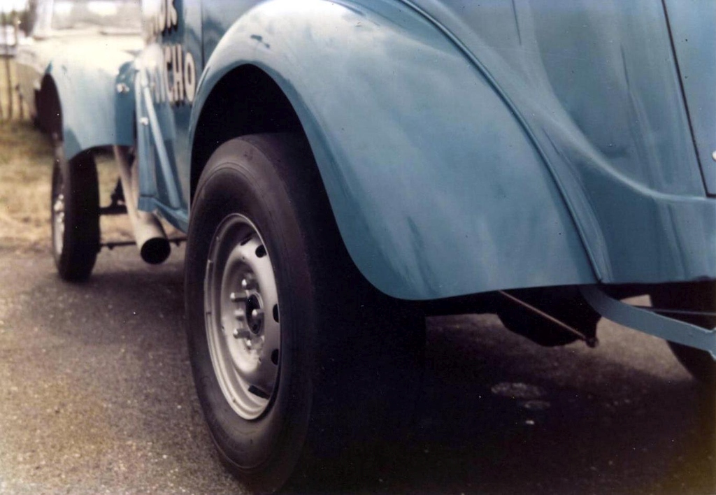 1972 saw another paint job, this time pale blue, by Alexander Coachworks in Hitchin, Hertfordshire and John Collier did the signwriting again. New fibreglass sills and wider rear wings were bought from Pat Cuss at Fibreglass Applications and the perspex windows were now red. Mick took over as the driver. Before he first drove the car, he was petrified not knowing what was going to happen. Brian remembers well before Mick’s first race in the fire up road he was out looking at the car every few minutes. Bob said he still does! Mick replied: When you first drop the clutch, you think the sky is going to fall in but it doesn't of course. Being set up with loads of castor the car basically wants to go straight, providing you don’t have too much wheel spin and once you've overcome this then you're fine, just a bit daunting to start with. Mick achieved a best of 11.88 at Blackbushe and still has the timing ticket! Bob drove the push car mainly, also during these years he organised the logistics and support needed by the team. He admits to not putting a spanner to the car. To get better times, Kelly Springfield slicks had been fitted and after doing a burn out which were just then becoming the norm, we misjudged the increased traction, and Mick pulled a huge wheelie. A few things got bent which we didn't notice until we fired it up next time and the throttle stuck open sending a conrod out the side of the engine block and that was the end for our beautiful Olds engine. We sold the Oldsmobile heads and other engine parts to Peter Lane and Ray Tucker for their Earspliten Loudenboomer Topolino, a year later. We raced at six meetings in 1972.