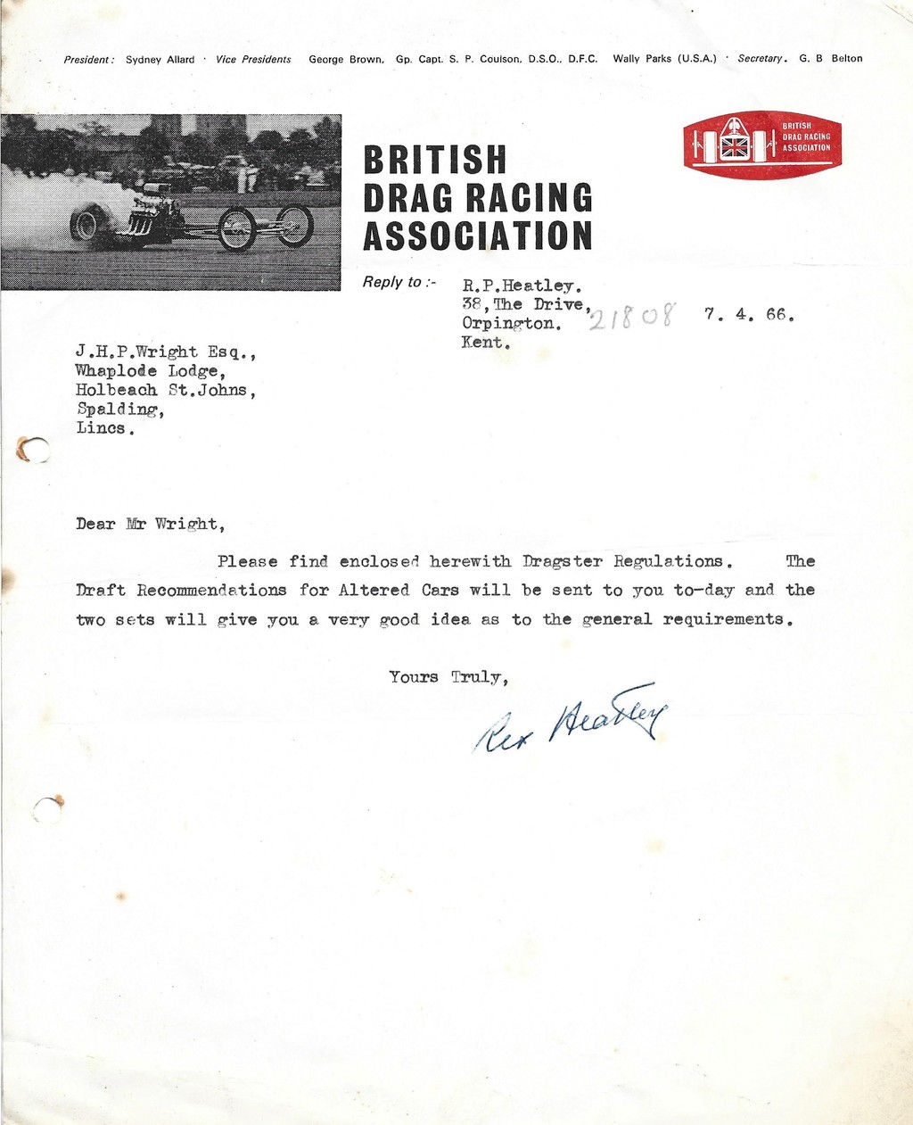 When I went to Duxford in 1964, I had stub exhaust pipes on my Hot Rod which made a noise with flames coming out but I couldn’t get any performance. They say with a standard camshaft you’ve got to have seven foot long 1 7/8th inch diameter pipes measured from the exhaust valve to the end, which I did and it all went as smooth as anything, I couldn’t believe it. When I put full race camshafts in you don’t need exhaust pipes at all. It’s the camshafts and the timing of all the valves that make a difference, I learnt all that from other drag racers. That’s one thing I liked about drag racing, they'd come and help you and tell you how to improve. I ran the Hot Rod at Santa Pod in 1966 in the new Altered Class.
