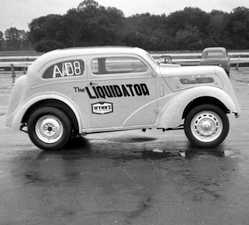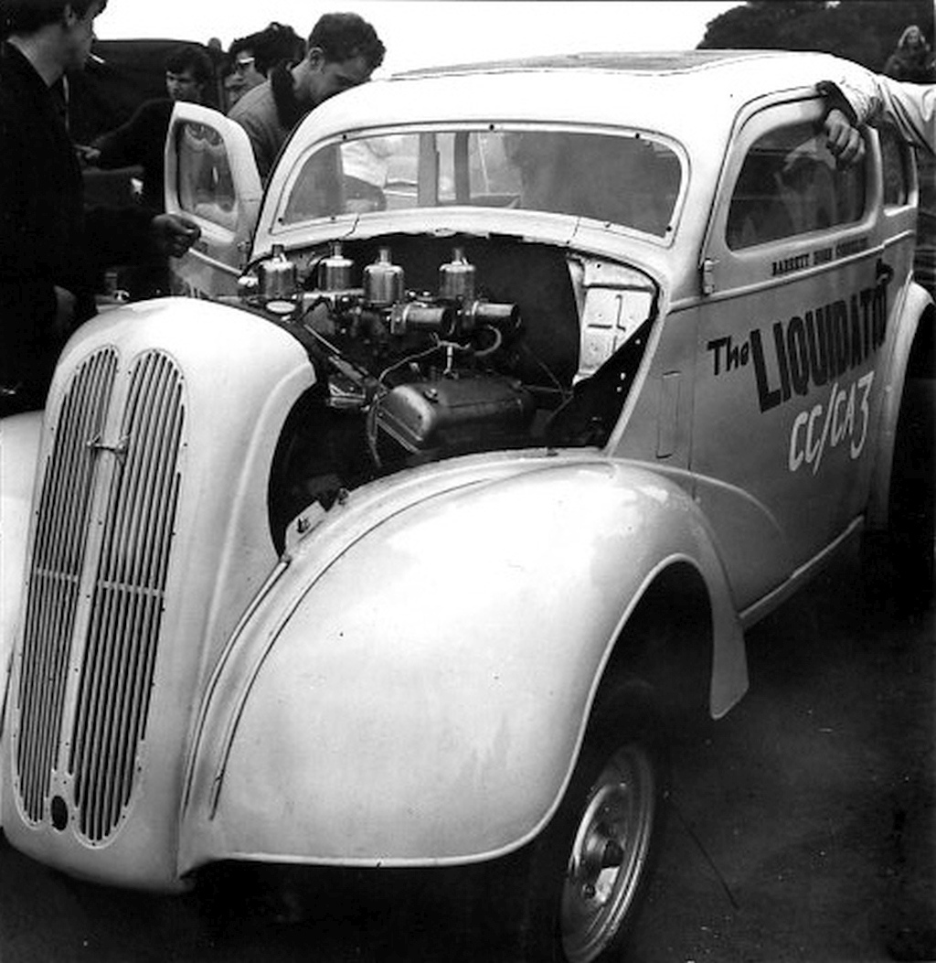 The Liquidator is one of those memorable cars from the early days of UK drag racing that people still talk about. It had a great name and the roof chop gave it a very striking appearance. Built by Geoff and Norman Barrett, Roger Horn and Mick Cornelius, who all came from the Luton and Dunstable area. Geoff Barrett... I was born in Dunstable and moved to the village of Ivinghoe, and then back to Dunstable at seventeen years of age due to dad's health. I started as an apprentice at AC Delco finishing up as a maintenance fitter. Late 1965 after watching the American drag teams at the 1964 – 65 Dragfests, Mick Cornelius, Roger Horn and myself decided to get involved in drag racing and the decision was made to build a Jag engined Anglia. Based in Dunstable we bought the Anglia locally from a friend of a friend for I believe £1. We towed it to our rented garage to remove the running gear and clean up the chassis (wire brush, no pressure washer or power tools here!) Next, we bought a complete 1953 Jaguar Mark 7 through Exchange and Mart, in London for £3, and towed to Dunstable to remove the engine, trans. and instruments. We didn’t strip the engine down and ran it pretty much as it came out of the scrap yard. I do not know how we did all this with no lifting gear! We then decided to use a Ford Thames van rear axle because it had a better ratio for drag racing and we kept the Mark 7 Jag gearbox. I did all the welding, oxy acetylene in those days, and we decided to chop the top. Time consuming with lots of cutting and welding, but I think it came out well. This was done with hacksaws, welding and filling. Painting, for a few beers, was done in a painting booth, by a friend of Roger Horn and Mick Cornelius did the sign writing. It took about 9- 12 months to build the car and the total build cost was £20. The name The Liquidator came about because of a spy spoof movie of that name which was out in 1966 and the lettering style on the car is very similar to the lettering on The Liquidator film posters. In fact, at the request of a cinema in Luton we put the car in their foyer for the week of the movie, after they had seen a picture of the car in a local Luton newspaper.