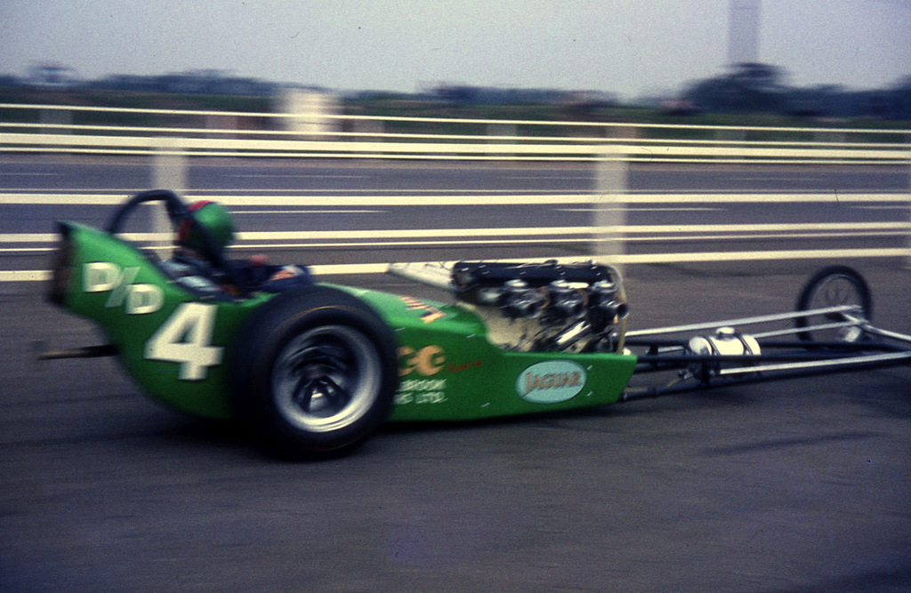 We talked and talked and talked about drag racing and hot rods and eventually adjourned to the Royal Oak pub, still talking about our mutual interest. I had a foot in the door and offered to help with the build-up of the new dragster. After visiting the garage seven nights a week for some months and frequently falling asleep at my desk at the Legal & General Insurance Company at Kingswood the next day, from where I later got fired, I was formally invited to be the third member of one of England’s first drag racing outfits. The first member and our sponsor was Jack Stillwell who in fact ran a small temporary shop called ‘Stripside Stores’ at the new Santa Pod Raceway, selling T-shirts, decals, fuel and motor accessories etc. He also had a heroic capacity for booze but that is entirely another story. Work had started on the dragster in November 1965 when Jack and Tony began designing the chassis and bodywork. They prepared drawings for the frame and sent these away to Hawker-Siddeley for stress testing. Work continued throughout 1966 and we debuted the dragster at Santa Pod in 1967 calling it Phaeton 1. The following year the name changed to Limelight after the pearlescent lime green Metalflake paint job that was professionally applied by Calbrook Cars in Leatherhead for free in return for carrying their name on the body panels. For the technical bit, our car had a Reynolds 531 tubular chassis, about 13 feet long with a narrowed Austin A90 back axle solidly mounted. The front axle was chrome plated 1½” diameter tube with Ford Pop spindles, brakeless of course, and Honda 50 moped wheels. This was located by chrome radius rods and had about ½” of vertical movement from a Volkswagen torsion bar suspension unit. The engine was a twin overhead cam straight six Jaguar Mk1 2.4 litre bored out to 2.8 litre to run in the highly competitive under 3 litre class and also keep the motor nice and over square. We fitted a gas flowed head, triple 2” choke Stromberg carbs on a specially built manifold, race cams, specially made 10:1 pistons and every moving part of the engine was hand polished and lightened. I remember well taking 3 weeks to hand polish the crank and rods alone. The estimated bhp was approximately 230 although we never had the car on a rolling road as every firm we approached flatly refused to let us try the car out! Fuel was fed into a distribution chamber from a small 5-gallon aluminium tank in the nose of the car that was pressurised with a foot pump prior to each run. We ran it on methanol and the jets in the carbs were so big that someone once said it would be better to chuck a bucket of fuel at the engine.