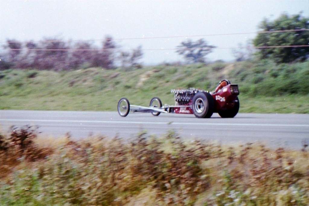 There was one particular meeting that we entered and we managed to bend a valve late one afternoon and because we were intending to race the next day it was decided to strip the top end of the engine overnight and attempt to repair the damage. Well, we got the head off and got the offending valve out. Tony and I were working at midnight with a club hammer and a set of files straightening the valve over a gate post. It all went back together again and the car performed admirably the next morning. One memorable occasion back in Sanderstead, we had just reset the timing and were desperate to try it out prior to a race meeting the next day at Santa Pod. It was about 10.30pm and we made the decision to fire up the dragster in the road outside Tony’s parent’s house. You know it was a very nice polite tree-lined quiet residential sort of area so, with Tony in the hot seat, I push started the car which instantly lit up with the unmistakable crackling roar of a highly tuned, unsilenced racing engine and an over-run like an Ack-Ack gun. The car was given a bootful down the quiet residential road and then rapidly shut off and frantically pushed back into the garage where we hid with the lights out convulsed with silent mirth tinged with apprehension as rather predictably 5 minutes later a small fleet of police panda cars and LE Velocettes cruised around the neighbourhood in response to a flood of telephone calls from highly alarmed and extremely annoyed neighbours. We got away with that one with a sound ticking off and a mini-lecture on consideration for neighbours as nobody had actually seen the car run. They only heard it.