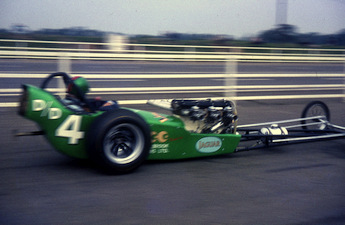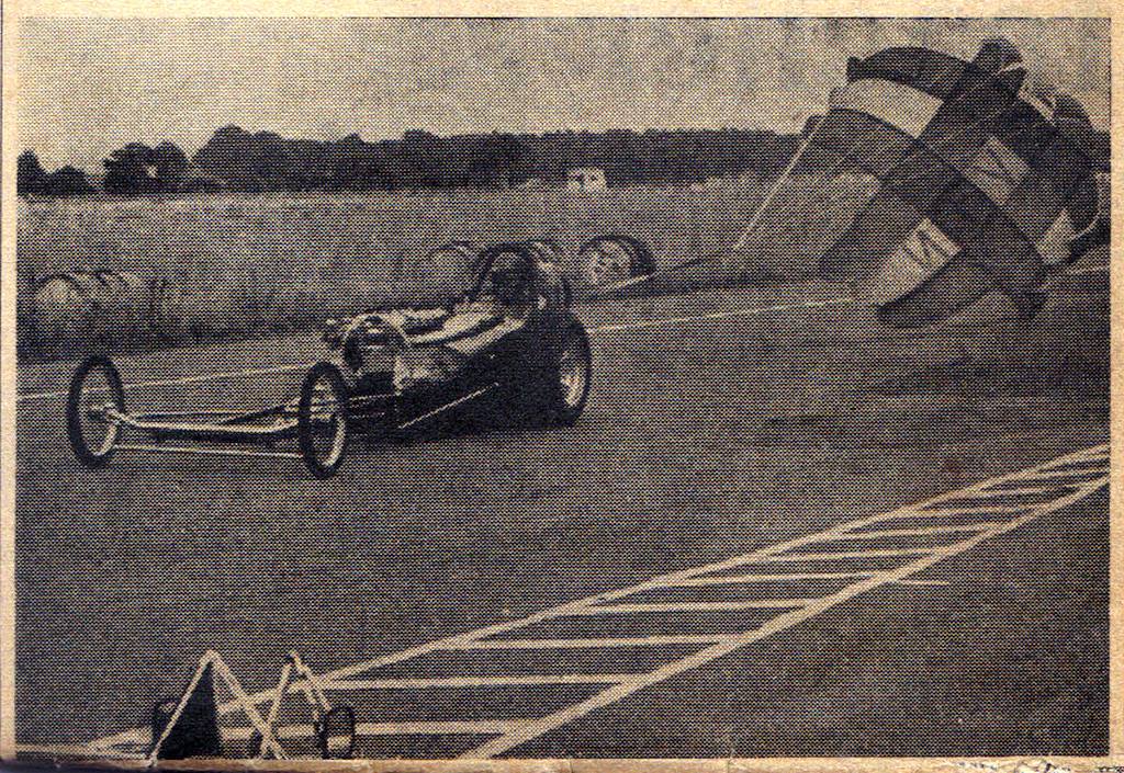 A brake lever on the right of the driver’s seat linked directly into the master cylinder to operate the rear wheel brakes only. Over our right shoulder was the parachute release lever that had a short Bowden cable with a pin that released a small drogue chute followed, hopefully, by a 10-foot cruciform Irving parachute that was specially made for us by Irving in return for having their name in big letters on the parachute. There was a central rev counter red-lined at 7500 and an oil pressure gauge and that was it. Before each run a complete visual check of the rail was made, we looked for any loose connections, bolts, linkages etc. Dragsters take a real pounding during a run and safety was always paramount. A couple of gallons of Methanol were poured into the tank which was then pressurized with a car tyre foot pump via a Schraeder valve. We did not run a radiator in competition, but we filled the block with water via a chromed filler tube that was fitted where the engine top hose used to be located. The push car then came up behind and pushed the rail forward in gear with the ignition and fuel switches off. When the oil pressure came up, the ignition and fuel were activated in that order. We used to start her in the old fire up road that ran parallel to the beginning of the strip, spectators got really close in those days and loved to watch the dragsters start up. With luck she lit up immediately and the six open pipes emitted an ear-splitting crackle, not far from your left ear. The rail was taxied round behind the control tower and up to the line. We always hoped that our competitor got staged before our engine cooked. When both cars were staged, there was about a 15 second wait, and during this time a second visual check was made. This was one of my jobs. I recall that two yellows at the top of the Christmas Tree meant that both cars were properly staged. The lights came down the tree one by one, with two ambers followed by a green. On the second amber, hold the revs up at about 4000, right on the cam, with the car in gear, clutch down, steadying her on the manual brake lever with your right hand. It was always best to allow the smallest amount of drag on the clutch to wind up the transmission, if this was not done the enormous shock load when the clutch was dropped would invariably break something. On the green, drop the clutch and floor the accelerator, hoping that she would not bog off the line. Many early drivers made the mistake of blipping the throttle for effect before launch, they were often caught out off the cam when the green arrived. I only drove the dragster once in competition as she was really Tony Brown and Jack Stillwell's car, and Tony always was the driver. I will recount that drive, probably the most exciting thing that a 21-year-old could do, (almost!) It ran bullet straight, but huge concentration was required. The acceleration on the first 30/50 yards was phenomenal. I was pinned back into the tiny bucket seat, holding the car straight with the aluminium butterfly steering wheel. Right foot never came up off the floor for the whole run. When the revs came back to peak, I think that was about 7500, about 150 yards out, a power on clutchless gear change was made straight back into top gear. The trick was to keep the engine at peak power all the way down the track. The last two thirds of the run were just a very noisy, bumpy blur with rapidly increasing speed until you saw the markers that indicated the end of the measured 1/4 flash past. As soon as you saw the finish line markers the procedure was magneto switch off, fuel cut off lever activated and let the speed drop to about 60 mph before gently nudging the brake lever. It was a very bad idea to lean on the brake at top speed as with rear wheel brakes only you ran the risk of de-stabilising the car. The 'chute was not always used, but Tony deployed it on several occasions, it did make the tail of the car very light when it came out. The return run back down the strip being pushed by the push car was all part of the theatre. My time for that run was in the low 12's with a terminal of over 100 mph. Sadly I lost my timing slip many years ago! Great days and a never to be forgotten experience. Video: Phaeton 1 drops the laundry One of my duties was parachute packing and I well remember Tony making a particularly fast run and then rapidly disappearing into the fields off the end of the track. He said I packed it badly, I said he forgot to pull the release ring firmly enough. Anyway, it didn’t deploy properly and Tony ended up half a mile away parked sizzling and bubbling in a field full of terrified pigs that had bolted off in all directions when they saw this missile heading towards them. I got a terrible bo****king from sponsor and driver as we had to wade through half an acre of mud to retrieve the car which by that time was liberally plastered with pig s**t. Half-shafts would let go at regular intervals and we always carried a stock of them in the back of the van. That was until we installed a narrowed Ford Transit axle with EN24T shafts made by Bootsie Herridge. We never broke one of those but we actually used to wind the splines a bit and somewhere in the back of my workshop I still have a half-shaft with nearly 60 degrees of twist on the splines.