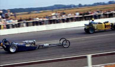 Our Morris Minor van was legendary. Tony Brown had fitted a BMC B series engine in it and I remember many times, towing up the M1 and overtaking cars at 60 plus. I will never forget the looks on other driver’s faces as they were overtaken by a little black Morris Minor van followed by amazement as they then saw a huge 4-wheeler trailer with a dragster on it hooked behind the van! When we had completely worn out the van, our sponsor bought us an Austin Westminster A110 which was much better not only for towing but we could also get more girls in the back seat and on occasions in the boot. This was when the Santa Pod owners had the temerity to start charging the 7/6d public entrance fee for passengers in competitor’s tow cars. After all, the girls were crew members, of a sort.