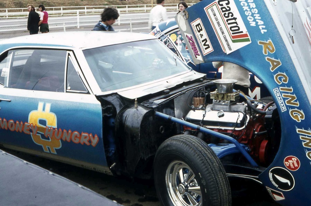 We had an Oldsmobile 394ci engine which was a big strong lump and cheap and didn't know at the time that a Chevy was the one to go for. We wanted a big V8 and that was the only one available. We had it balanced and cleaned up, and had a mild cam and a B&M turbo hydro stick four-speed, the same box which Cadillacs and Rolls Royces used. It had a fluid coupling rather than a torque convertor. We were very keen on the idea of an auto box because they seemed reliable and they took a bit of the shock load out of the transmission. A lot of the cars had a modified manual Jaguar boxes bolted on to a Chevy and they were big strong things... You've got enough to think about without changing gear. John Dickson: We would win races because we didn't miss a shift. We were half a second slower in the first year but it hung together and didn't let us down. We hired a garage down the road from two little old ladies. Roger Marshall: It was a single garage and had a little workshop packed with pieces, and us, and the car and did most of the work there ourselves. There were a few things we had to pass to others such as the exhaust system which was eight straight pipes which was done by a very old guy with plenty of experience called Mr Hall who worked at Hans Motors. After we got it back he told us he had to make them with the car on the trailer. When we got it back they didn't fit - so we spent a few hours filing and hammering getting them to fit.