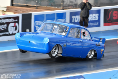 The car, painted the same blue as Danny’s previous Lil Lizzy Beetle, first came out at Big Bang in April 2017 for shakedown runs. The car came back in Dragstalgia 2017 and ran a best of 9.926/137.70 there. At the start of 2018 Danny chose to revert to Lil Lizzy, but at the Retro Show driving his Fiat X1/9, he went 9.85 but then the chute caught the wind, sending the car into the barrier.